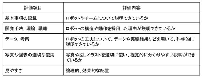 全チームのポスターは、審査員が以下の評価基準に基づいて審査する。なお、手書きによるポスターおよびデジタルで作成したポスターのいずれであっても、審査において有利・不利が生じることはない。